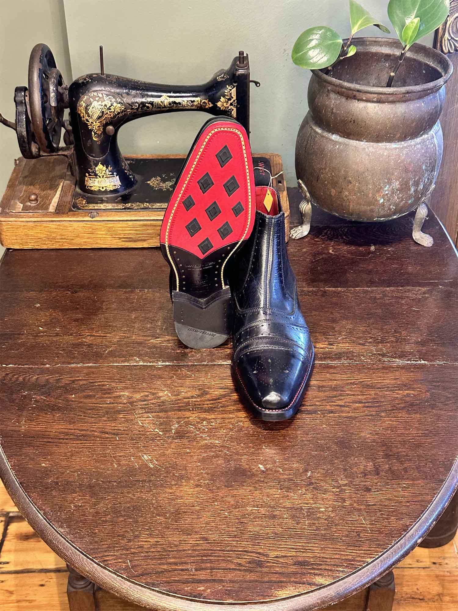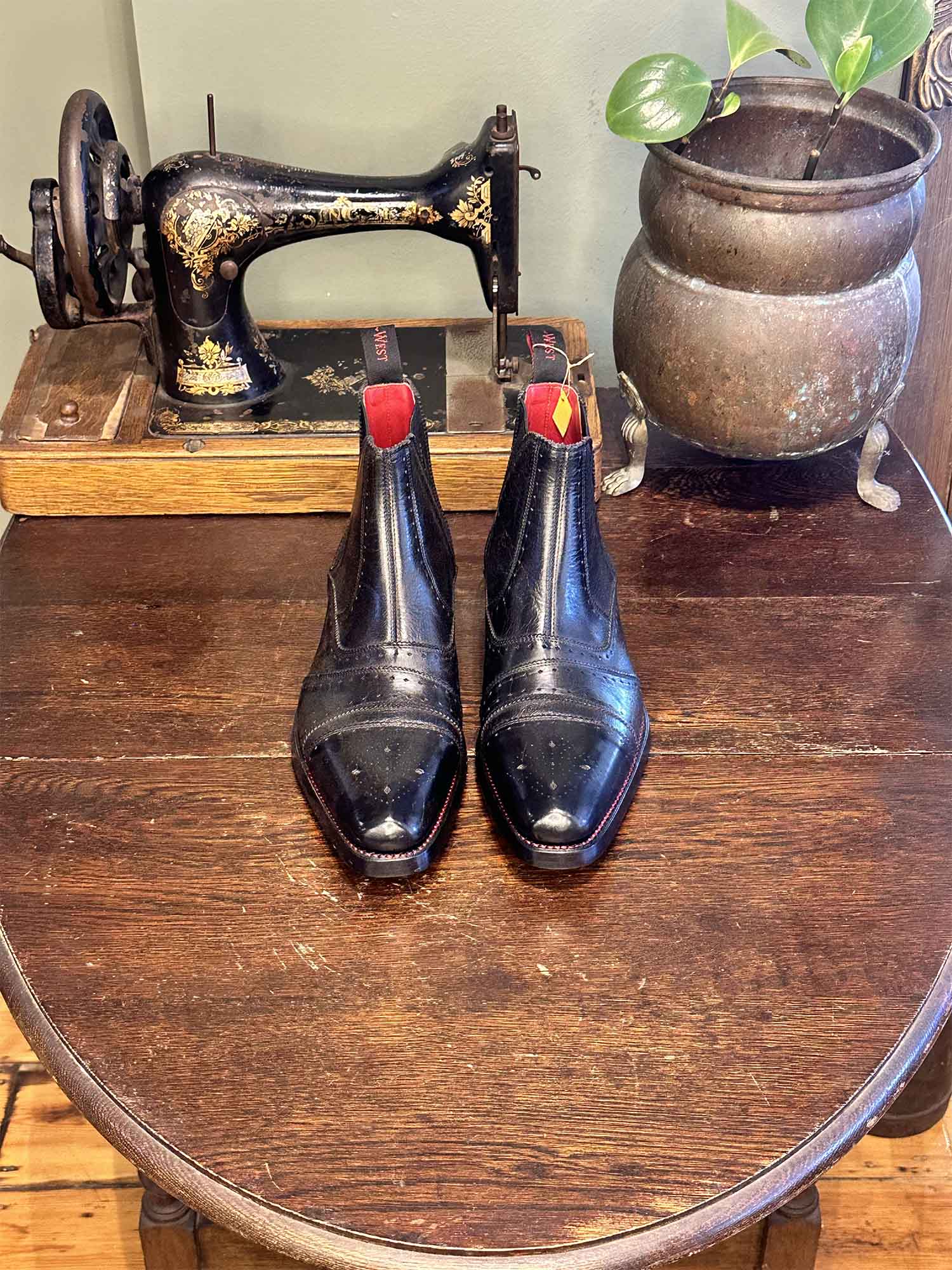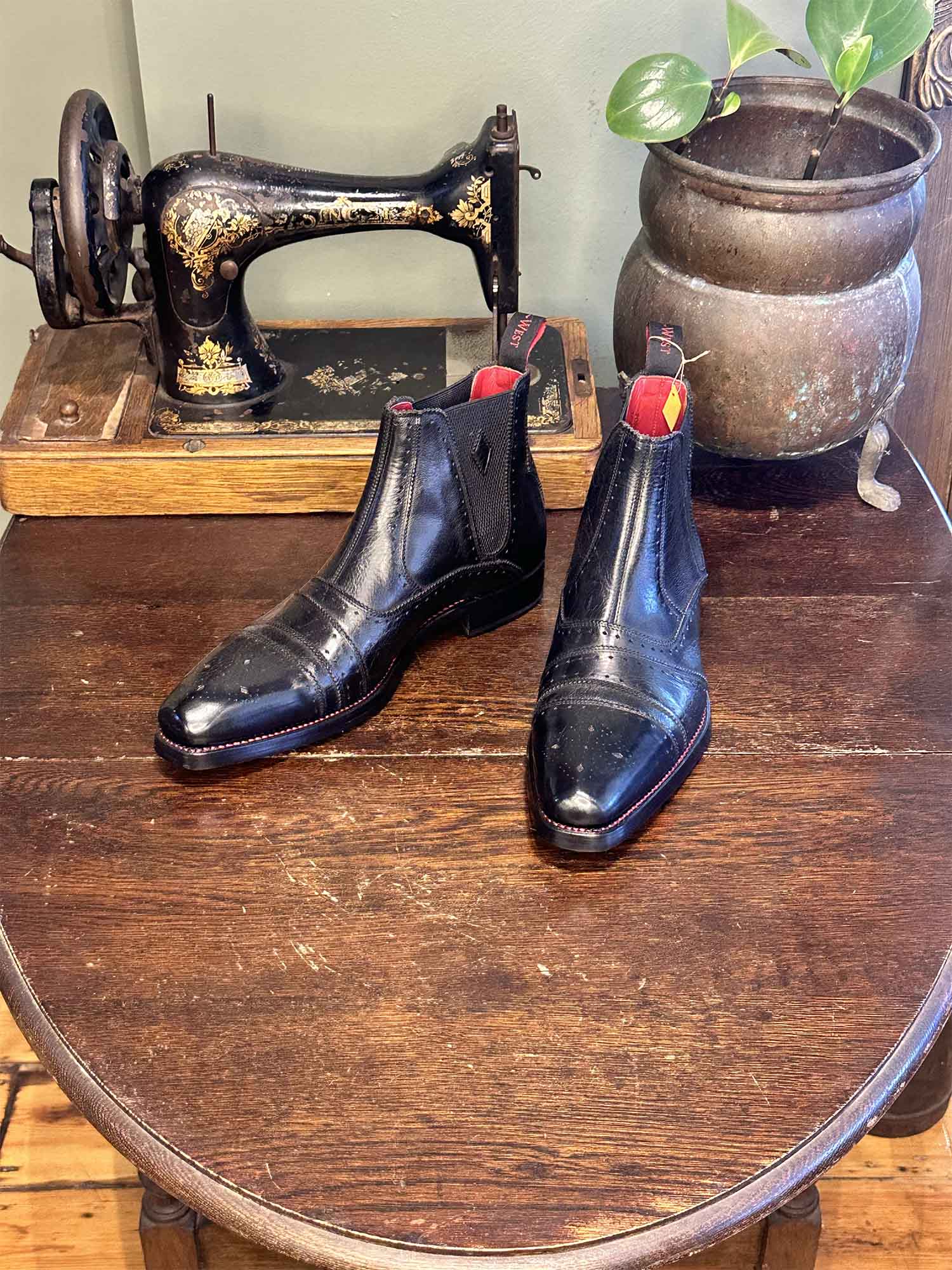 The Dexter ‘Point’ Cricket Front Chelsea in our distressed effect Rustik Black leather with the Cross Toe Punch and our Victorian-esque diamond punching. Detailed with a diamond elastic gusset and contrasting red welt stitch along a Black sole edge.