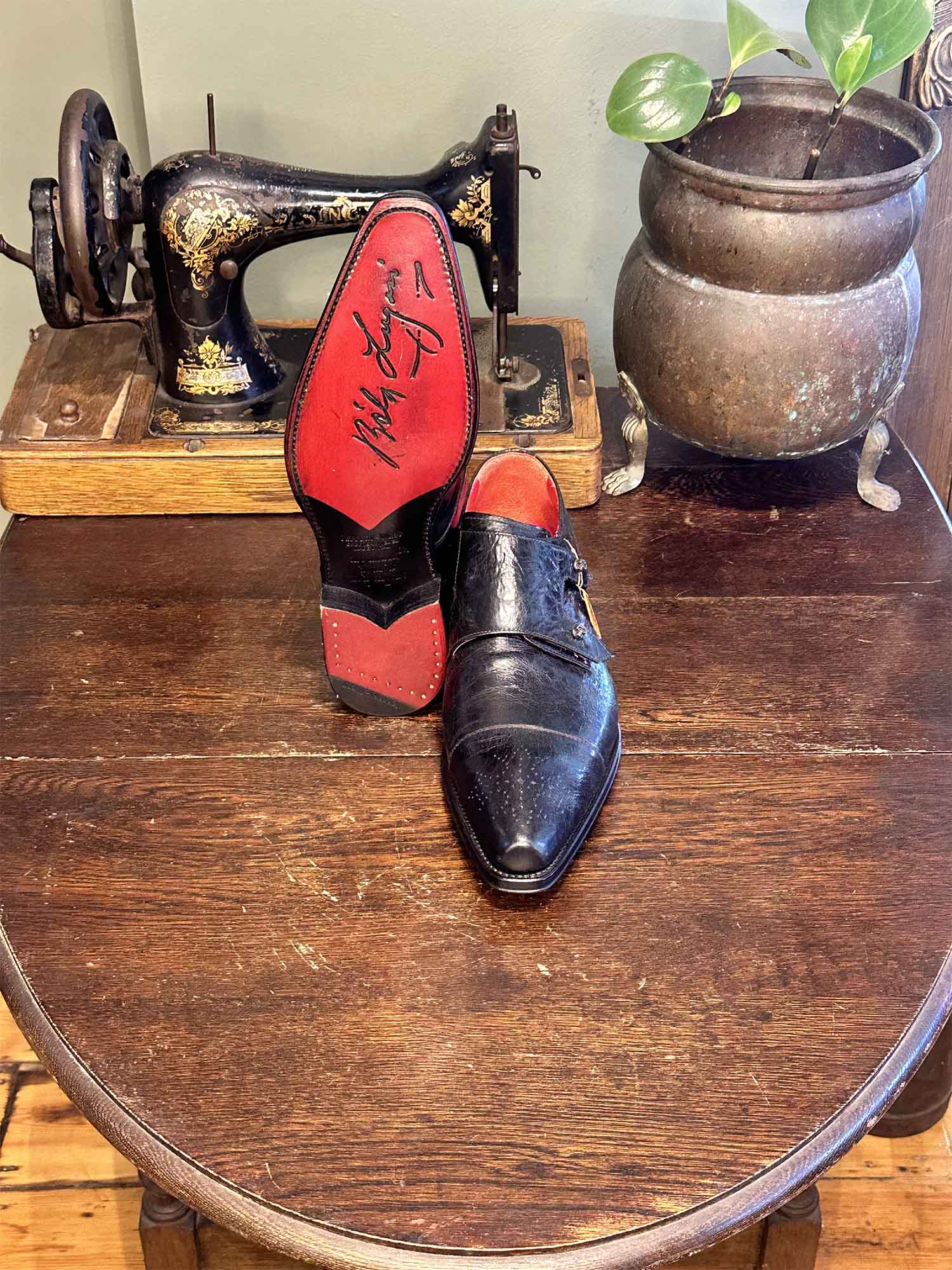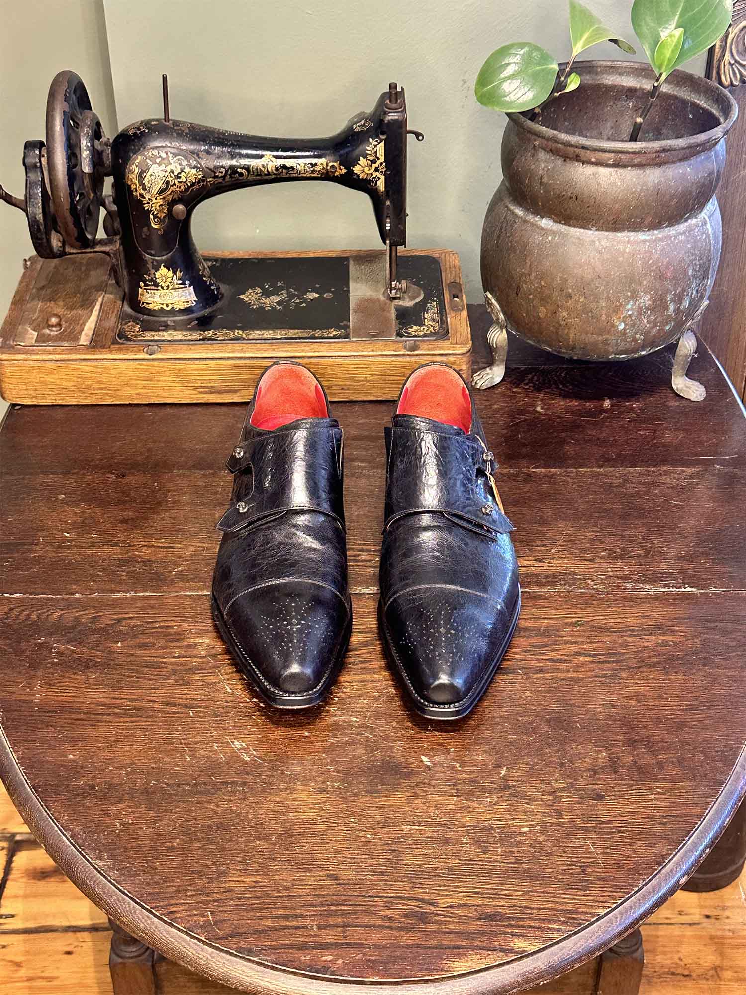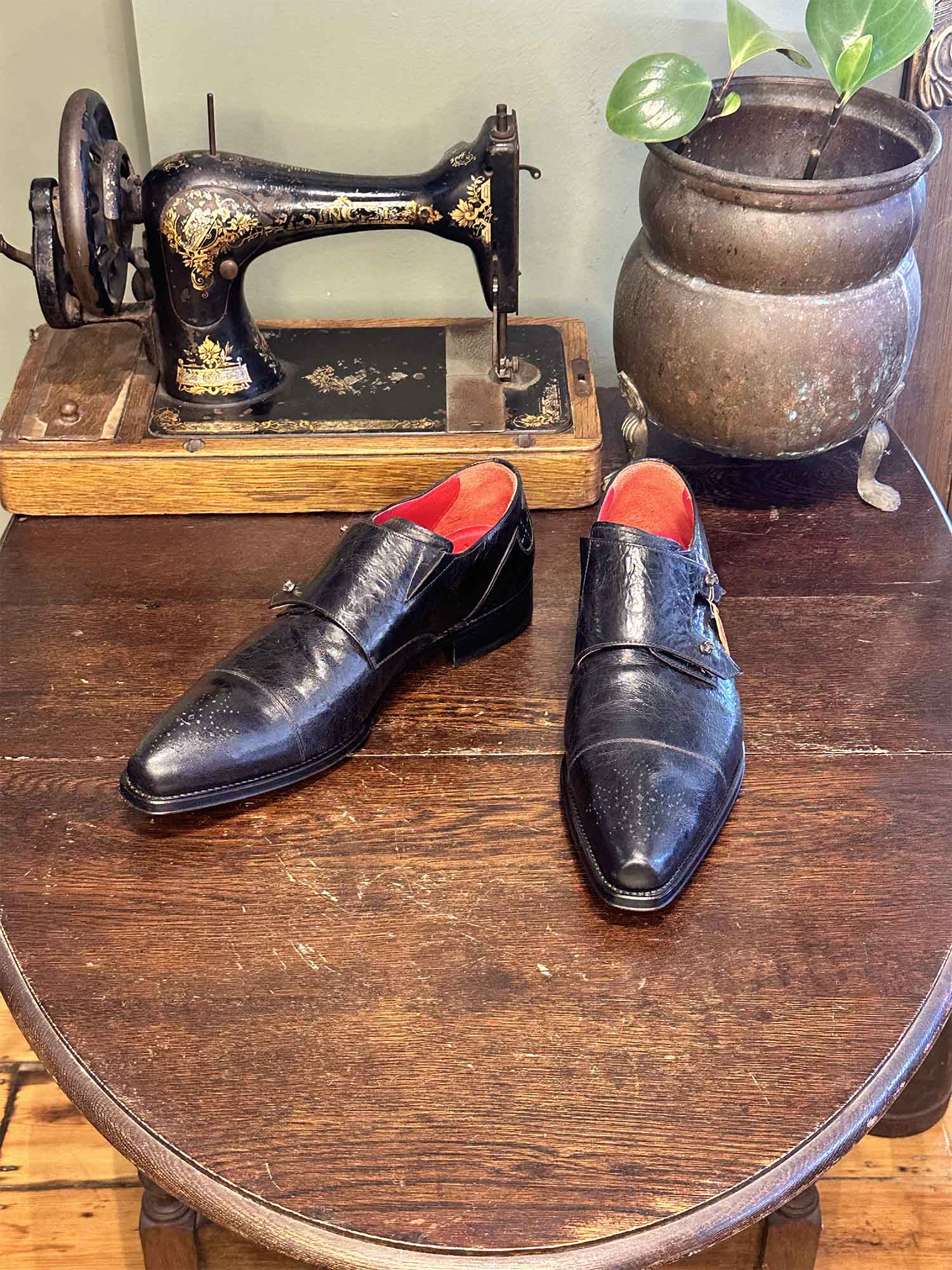 The Lugosi “Crypt” Double Skull Stud Strap, Toe Cap Shoe in Black Botticelli Leather with signature diamond punched lines.