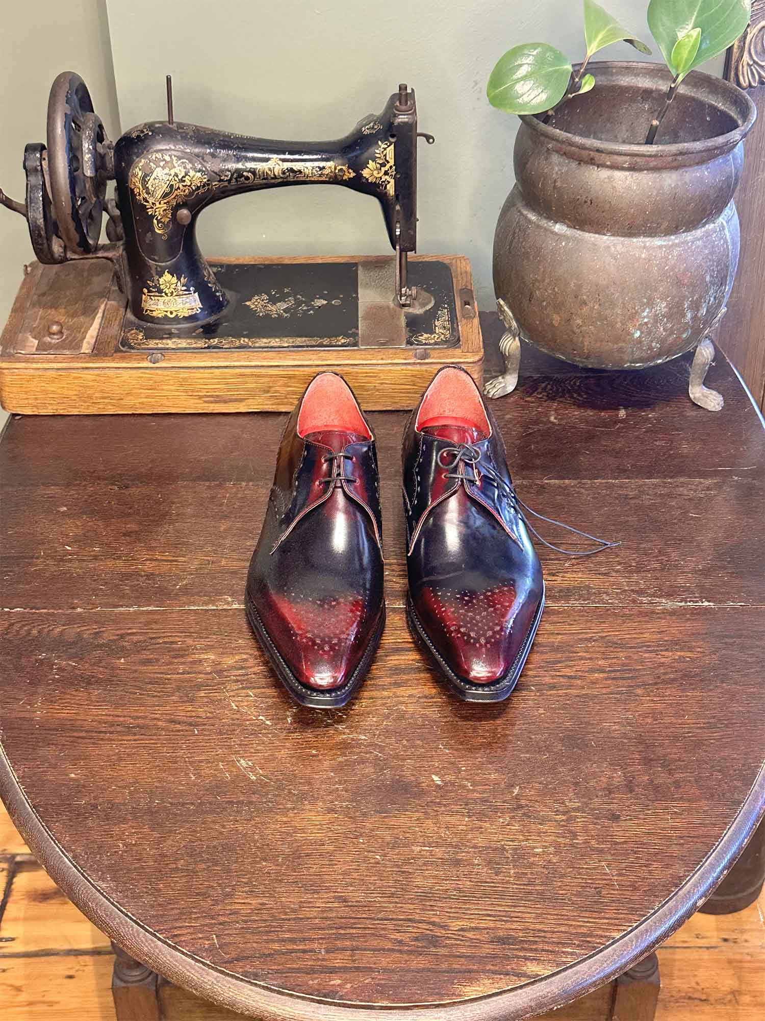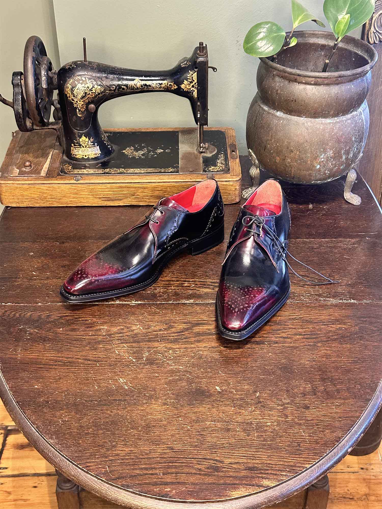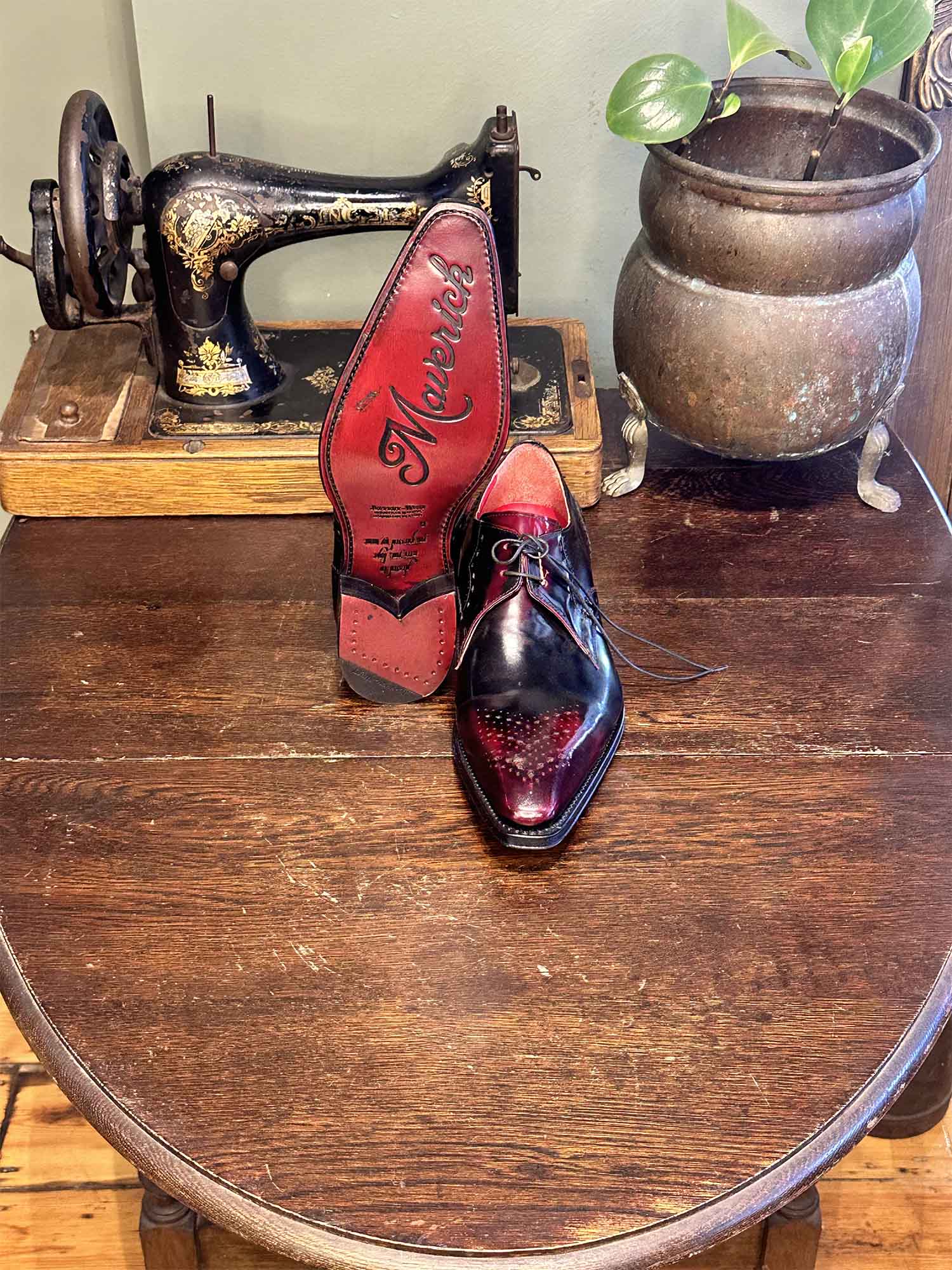 The Moon “Merlin” Gibson in Polished Burgundy Fume with Chevron Punch detailing on the toe.