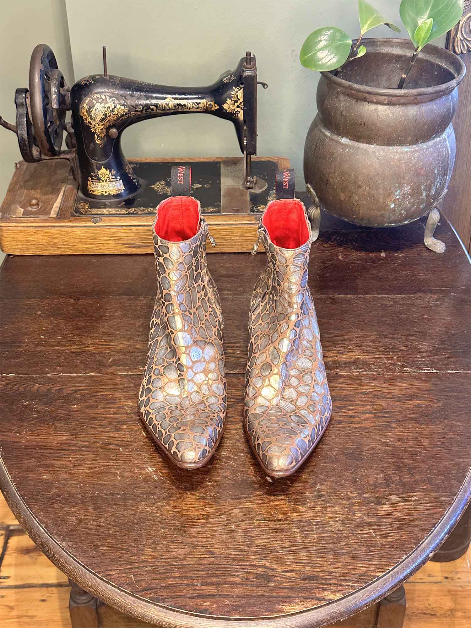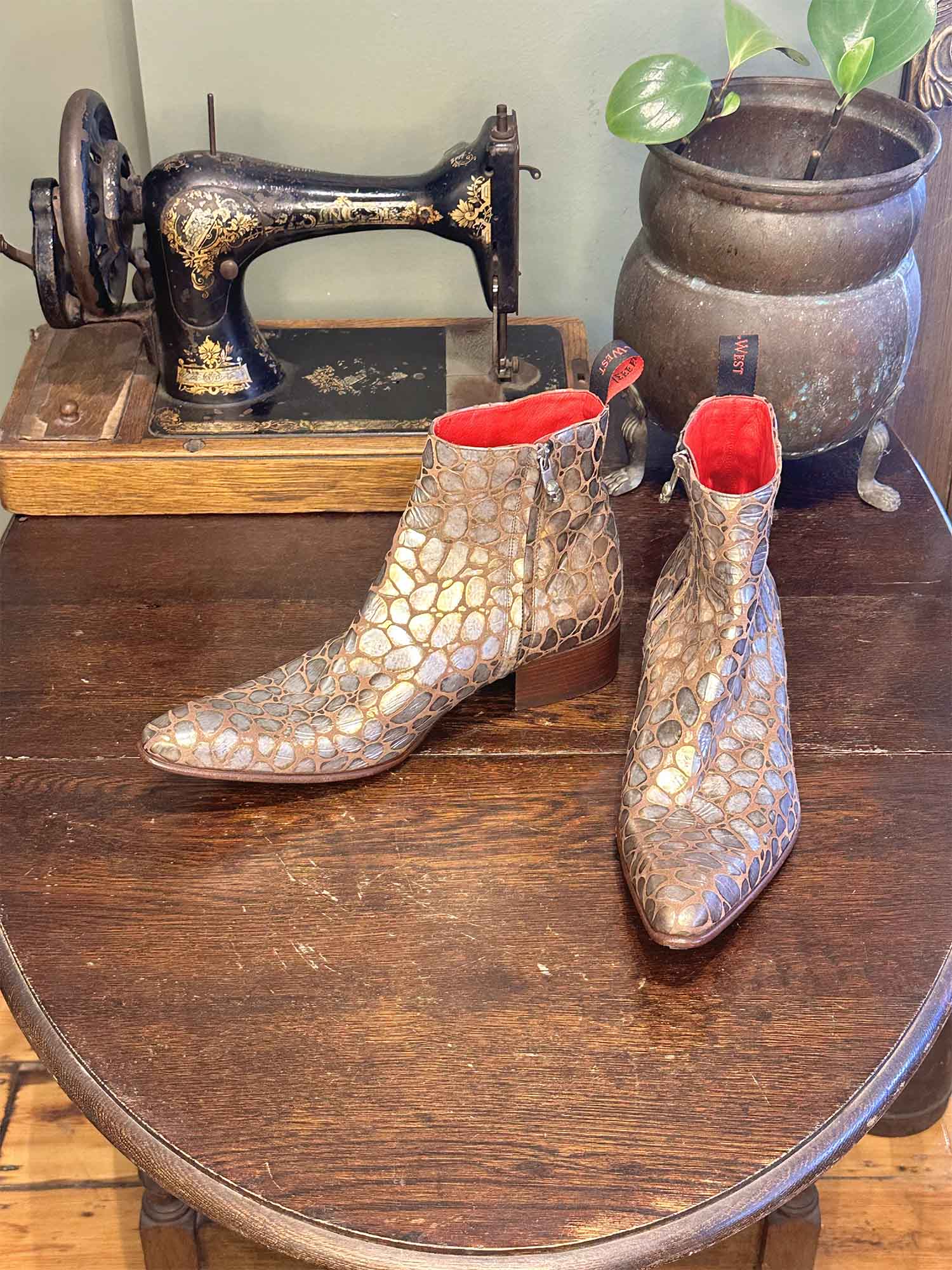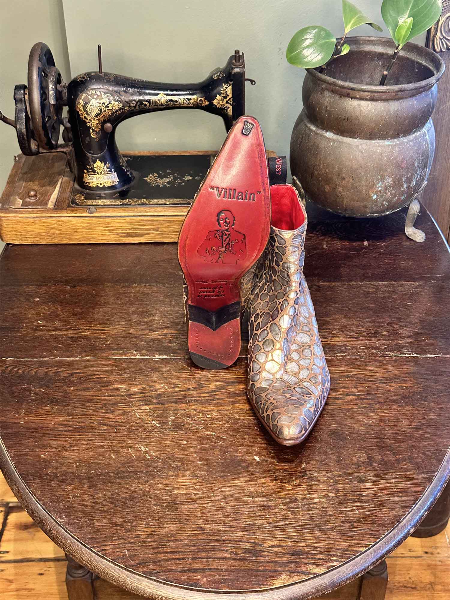 The Rochester ‘Crusader’ Skull Zip boot in the printed Dragon effect Gold Silver leather and our new “Villian” red leather sole embossed with the iconic Richard Burton.